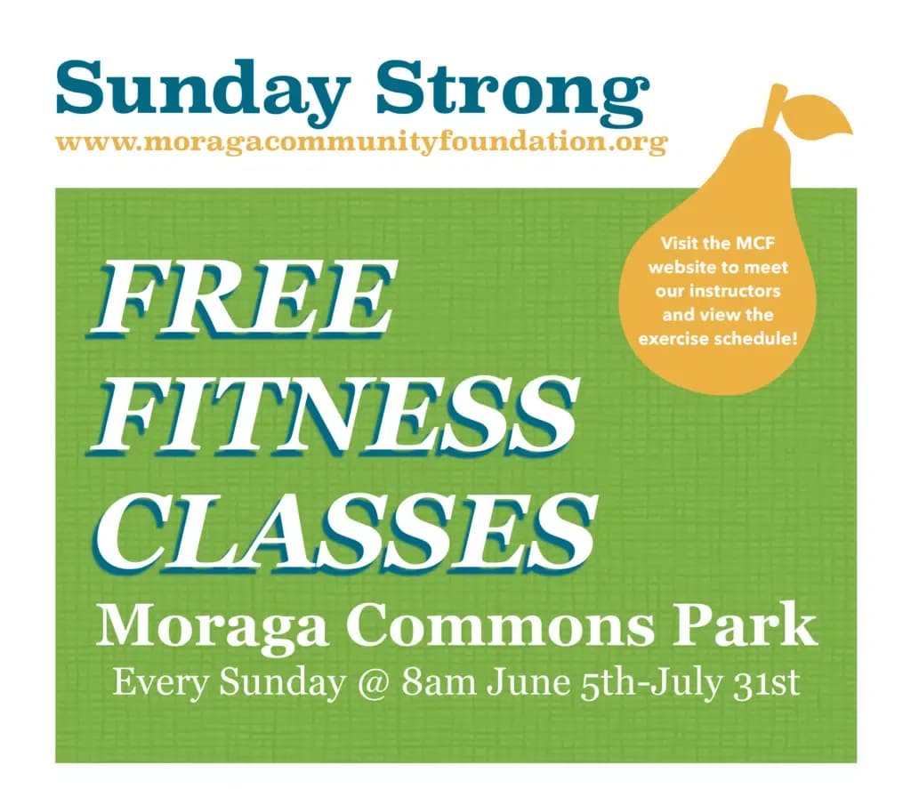 Sunday Strong! Free summer fitness classes at Moraga Commons begin June 5. Presented by MCF, with the sponsorship of the Town of Moraga Department of Parks and Recreation. This program is free and will be held every Sunday in June and July at 8 a.m. on the grassy area near the intersection of St Mary’s Road and Moraga Rd. Schedule: June 12 Flow Yoga; June 19 Tai Chi; June 26 Mat Pilates; July3 Bootcamp; July 10 Flow Yoga; July 17 Mat Pilates; July 24 Bootcamp. See Moragacommunityfoundation.org to register and see our amazing instructors’ bios.